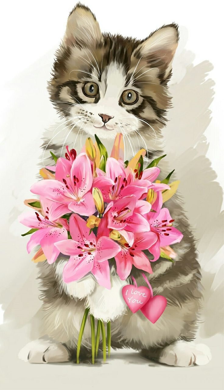 Котик с букетом цветов