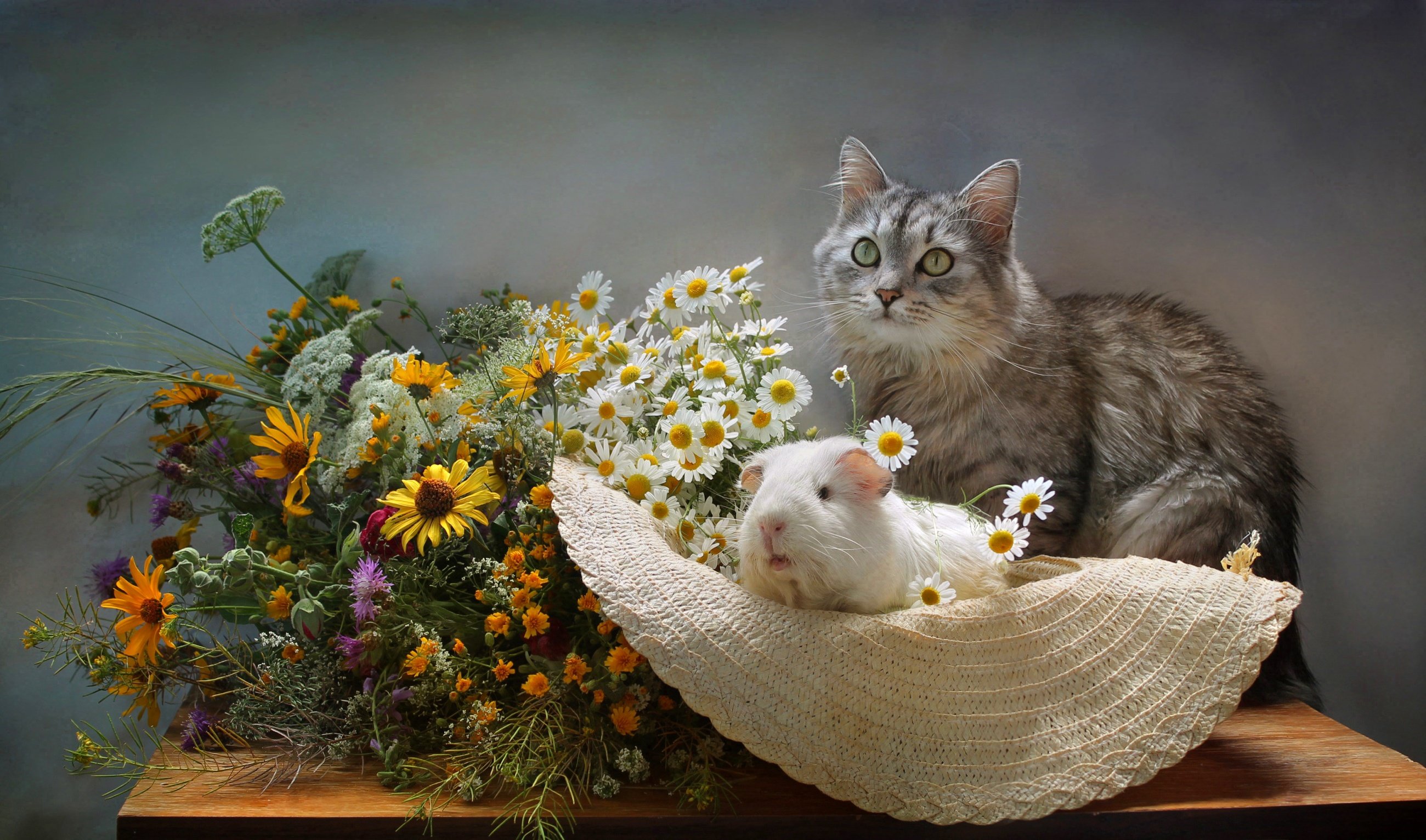 Кот с букетом цветов