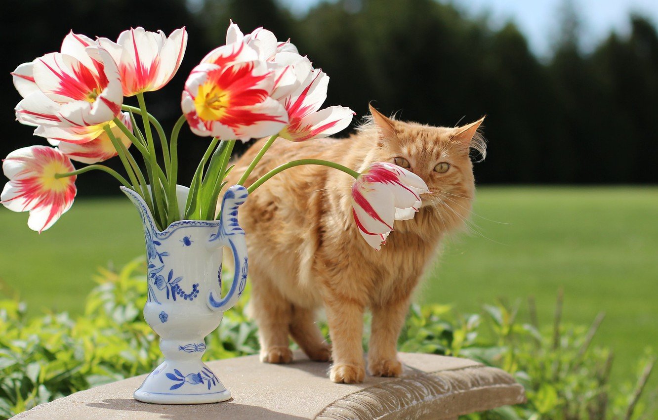 Рыжий кот с тюльпанами
