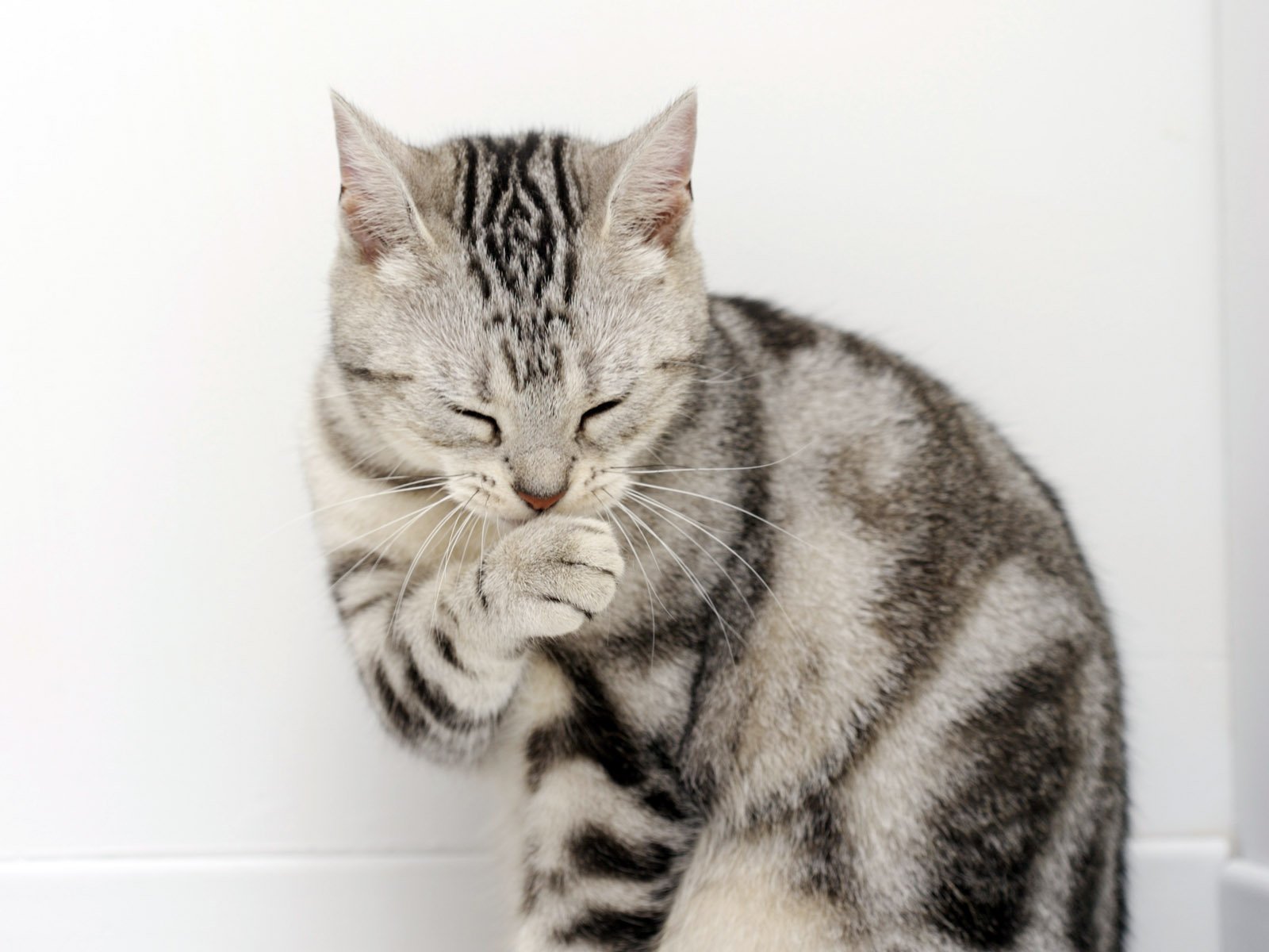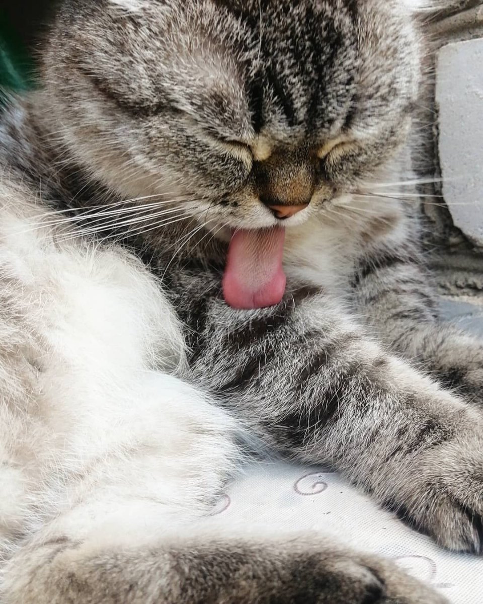 Серый кот умывается