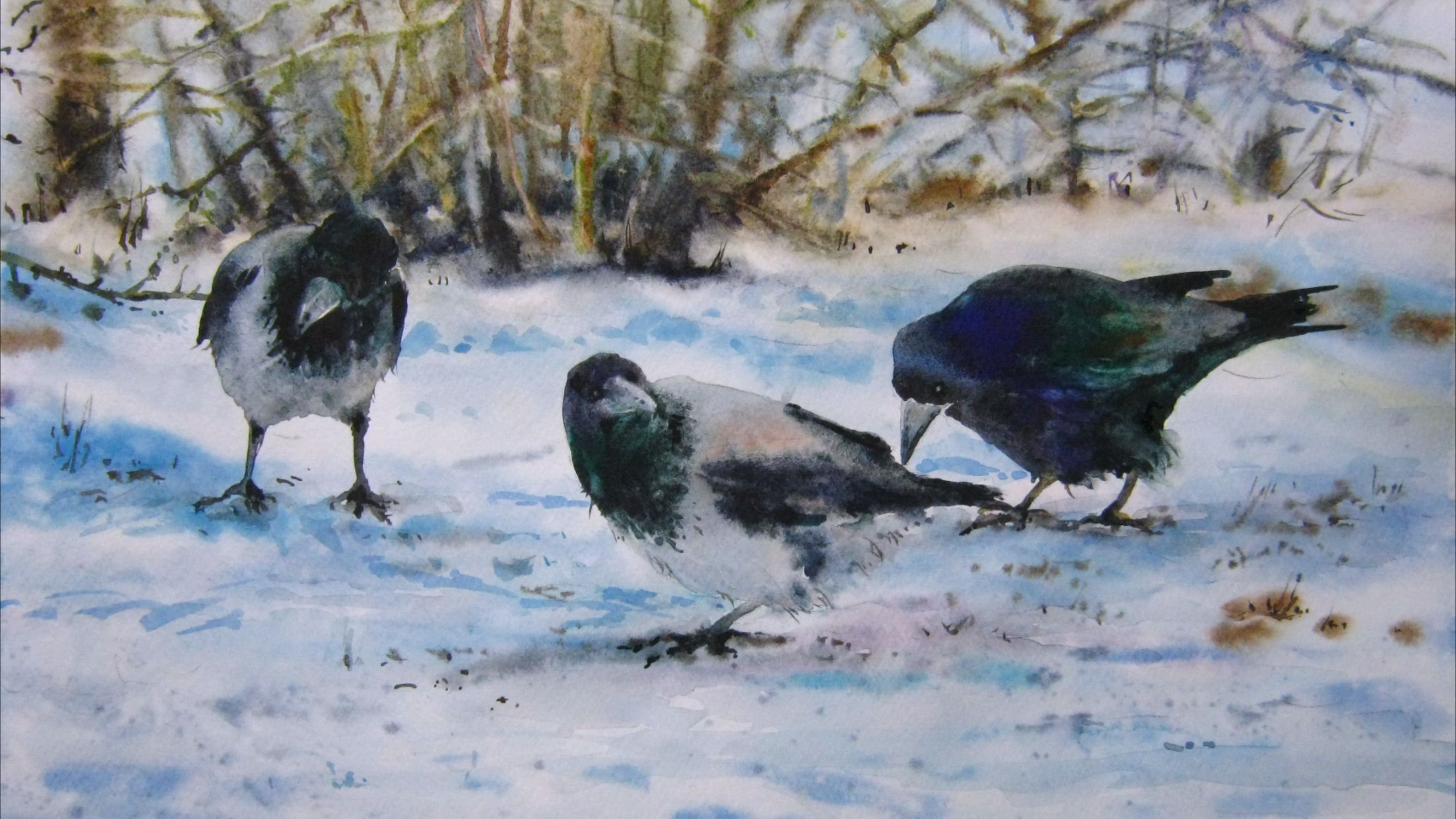 Птичка и снег живопись