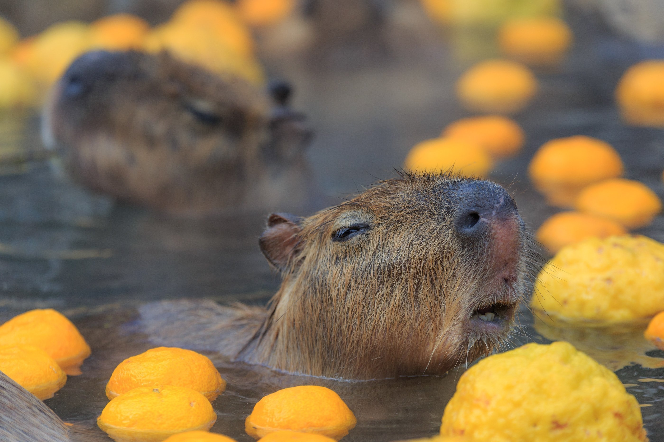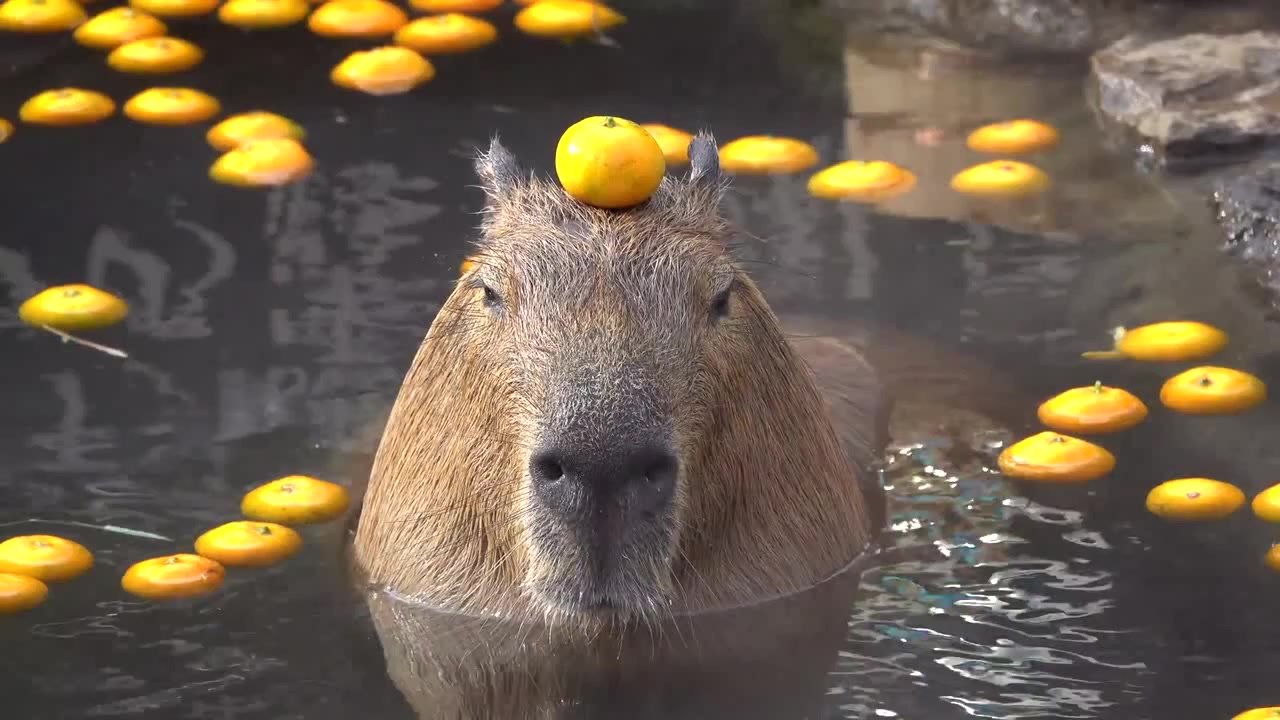 Капибара купается в апельсинах
