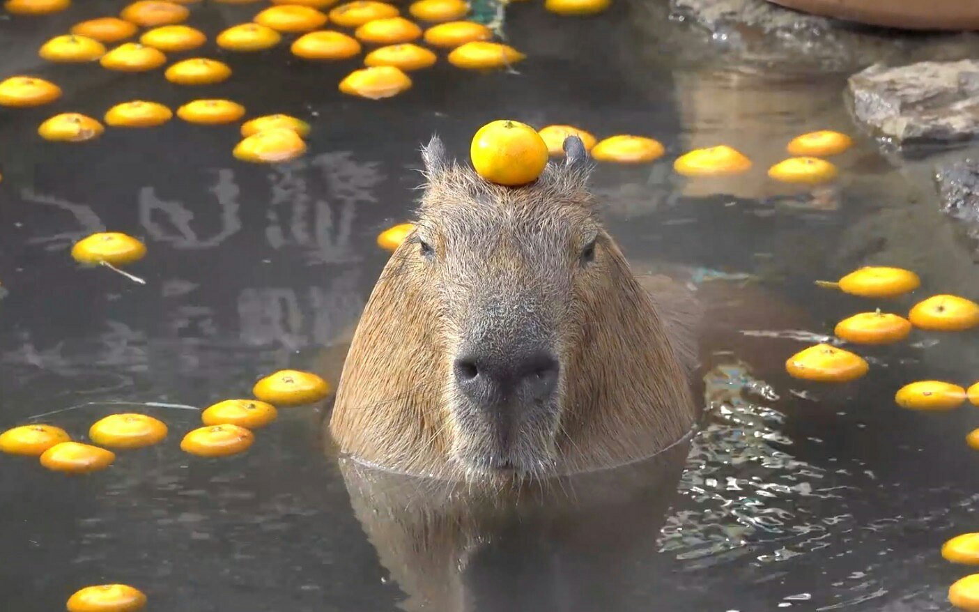 Капибара с мандарином на голове