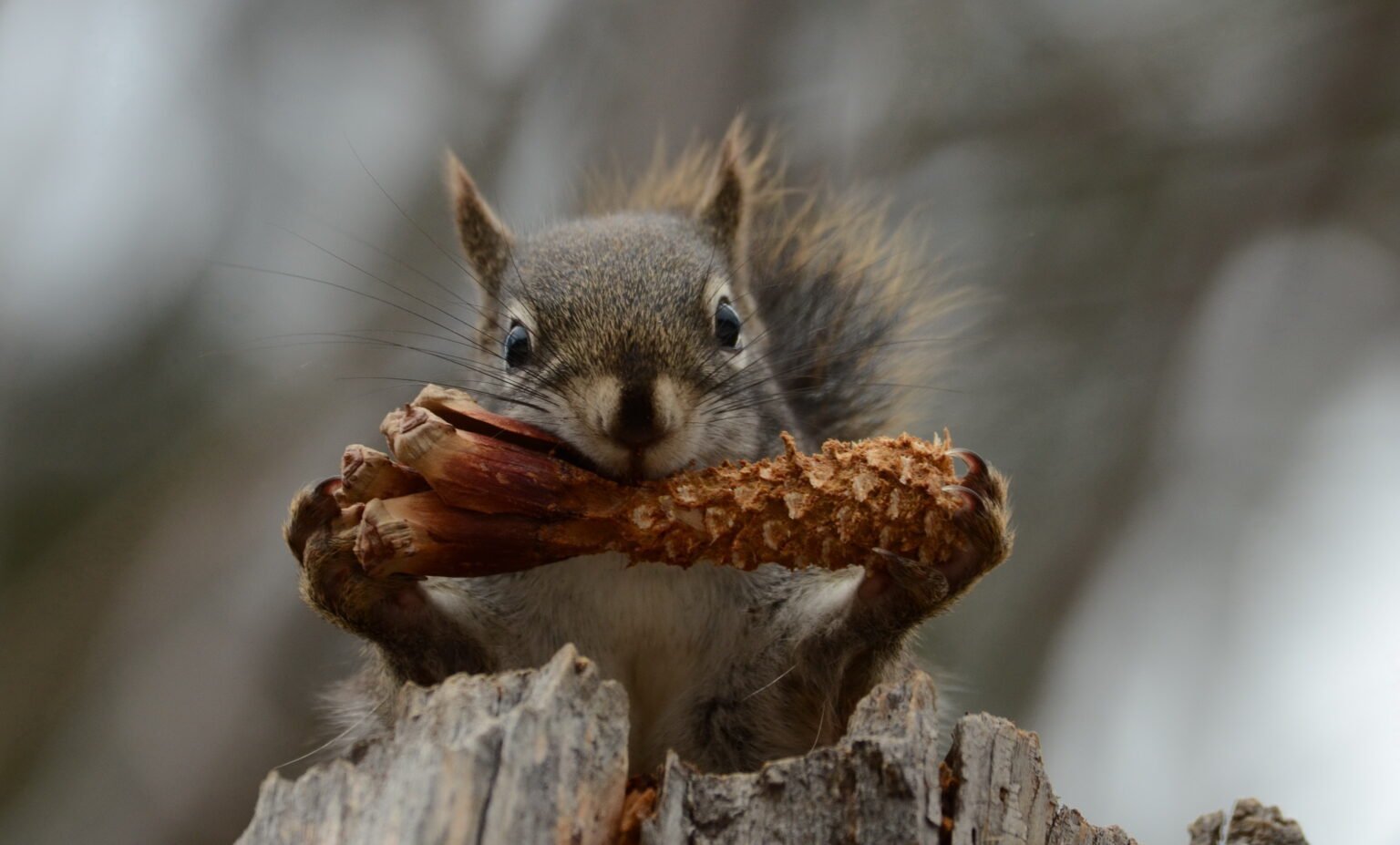 Белка грызет шишку