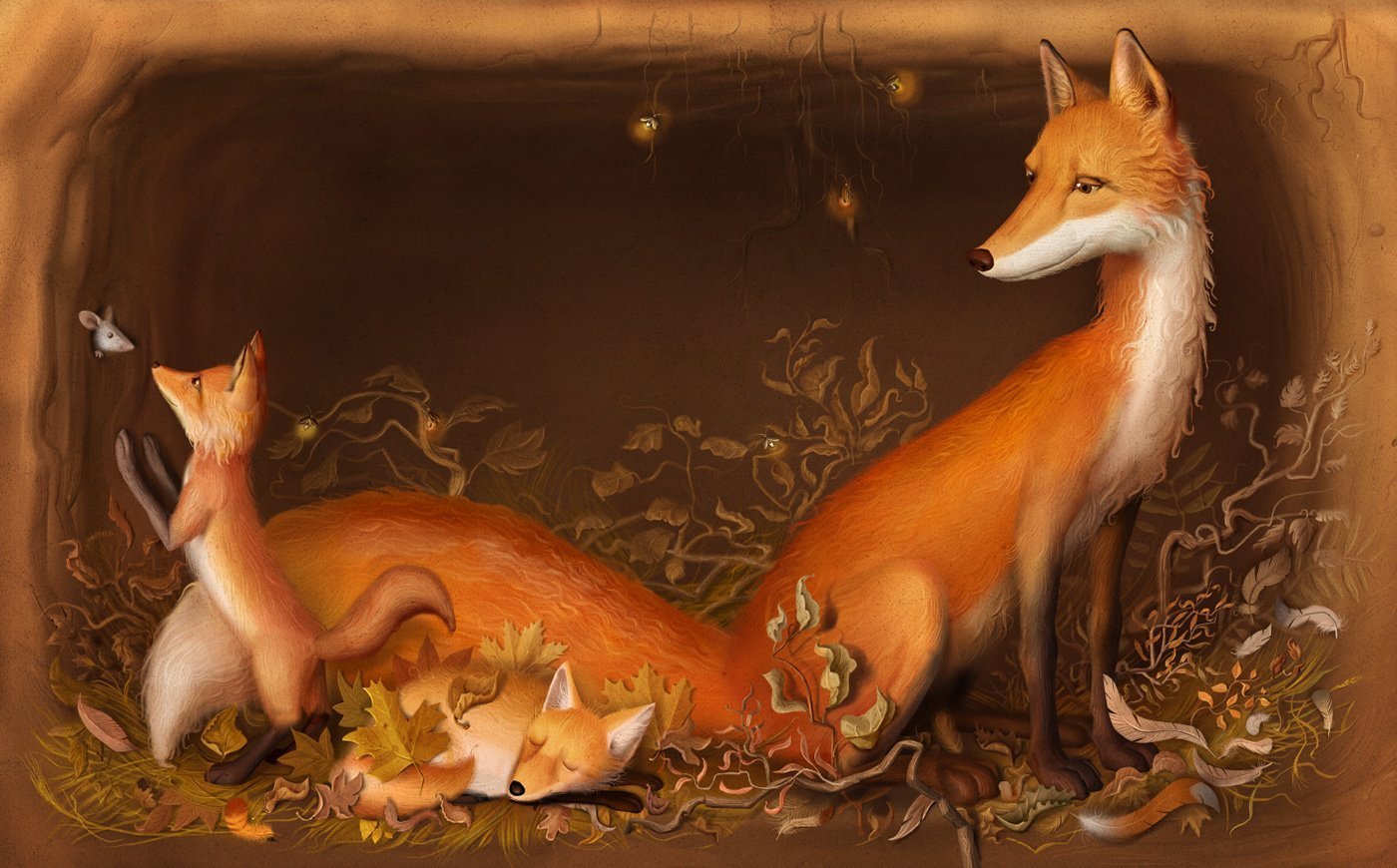 Лиса живопись с лисятами