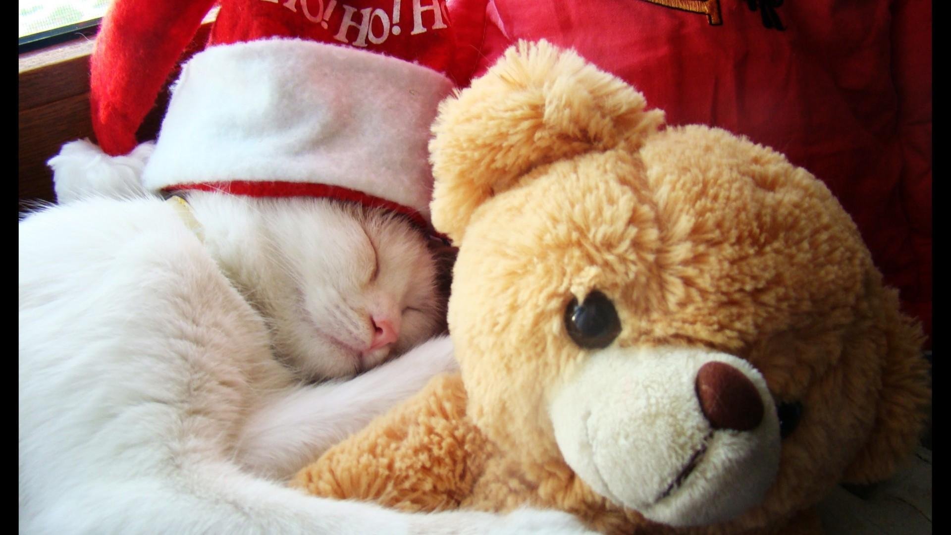 Спящий котенок с мишкой