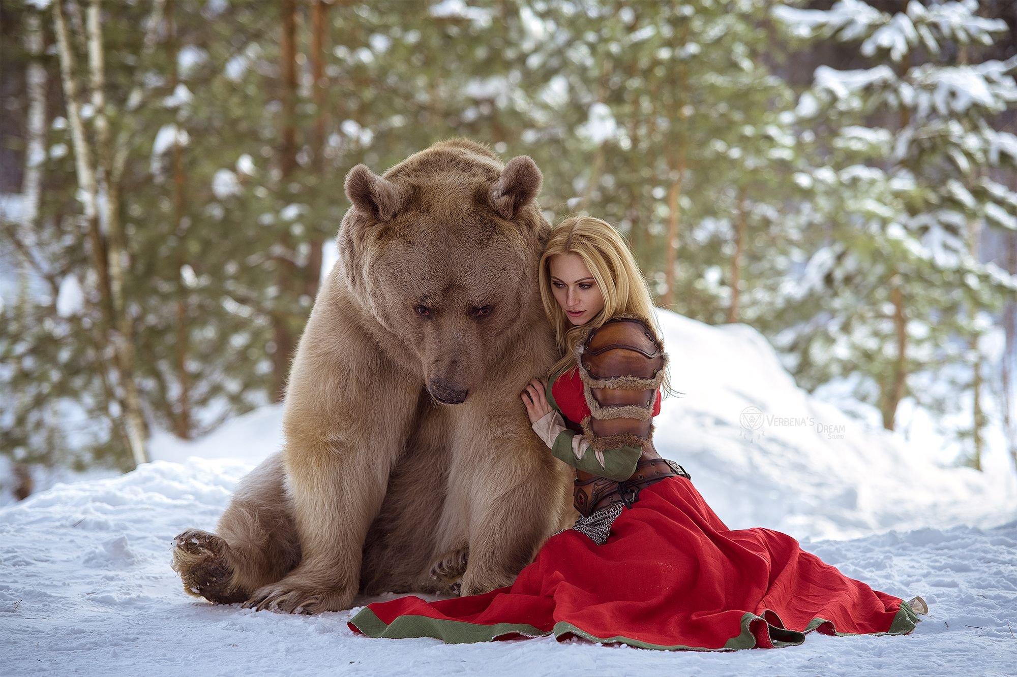 Медведь обнимает девушку