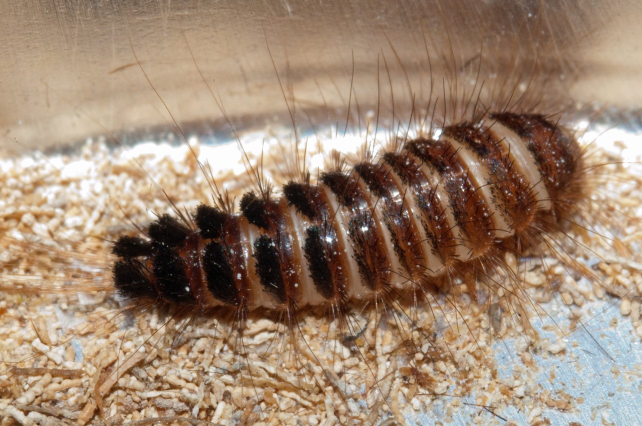 Мохнатая личинка жука кожееда
