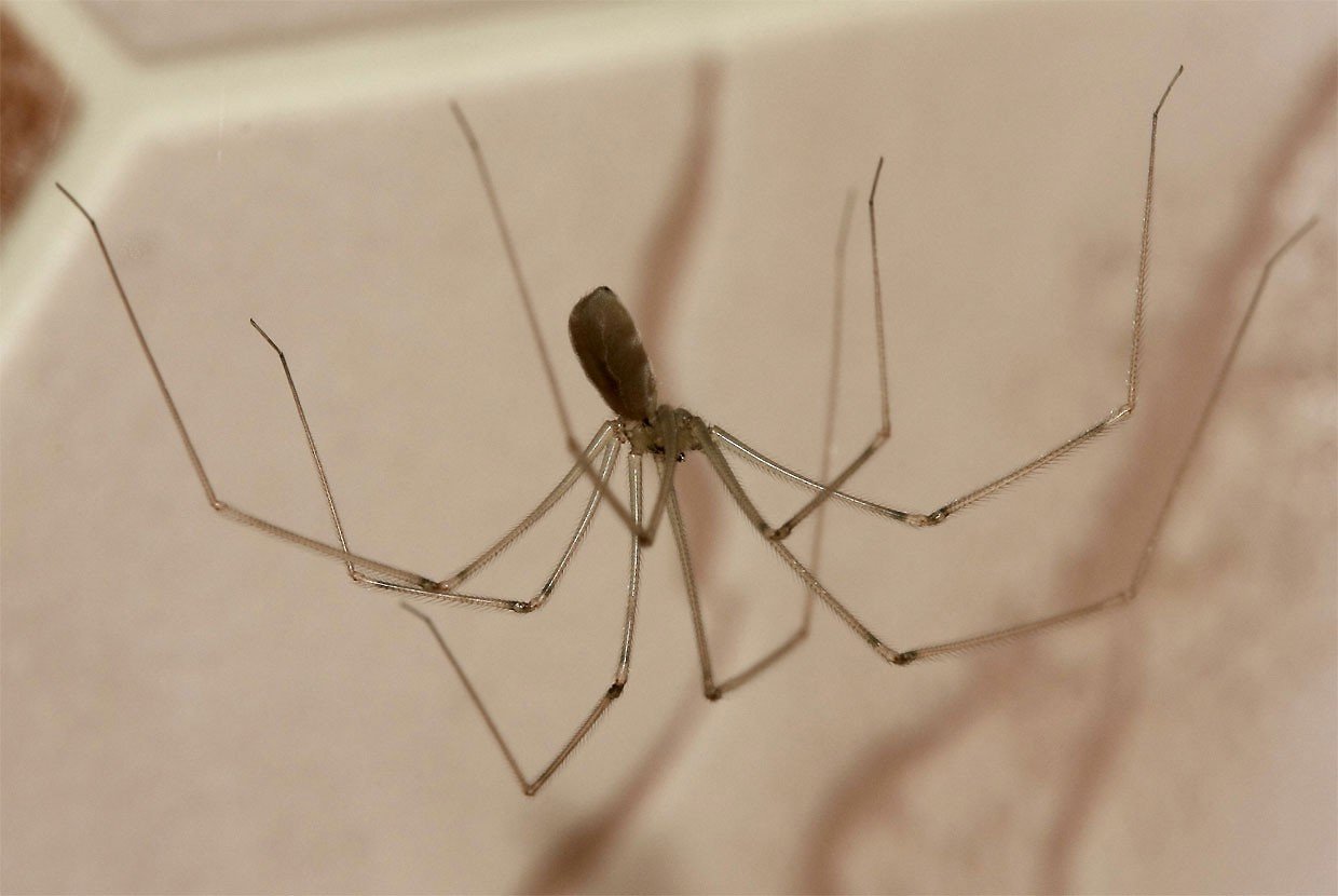 Серый паук с длинными лапами дома